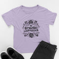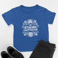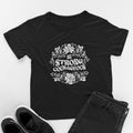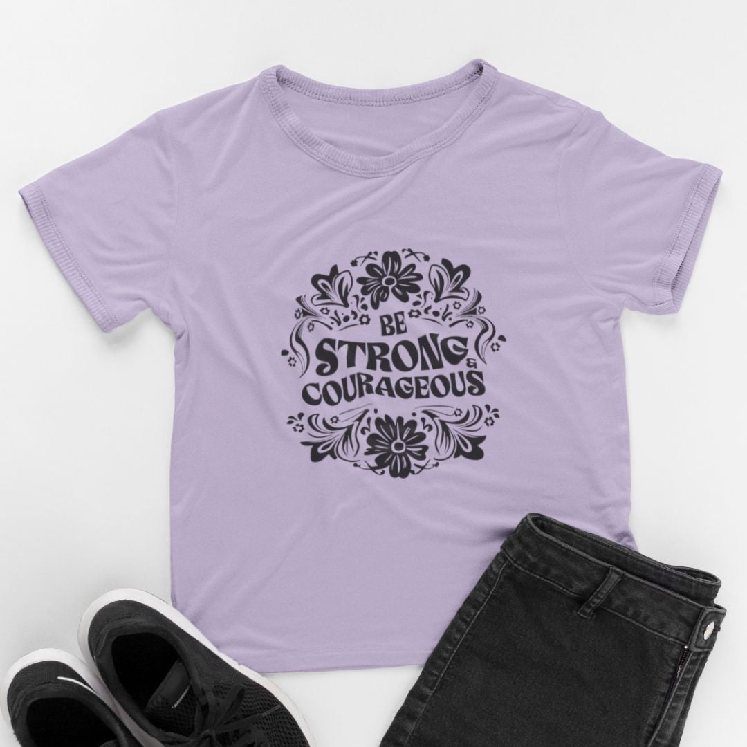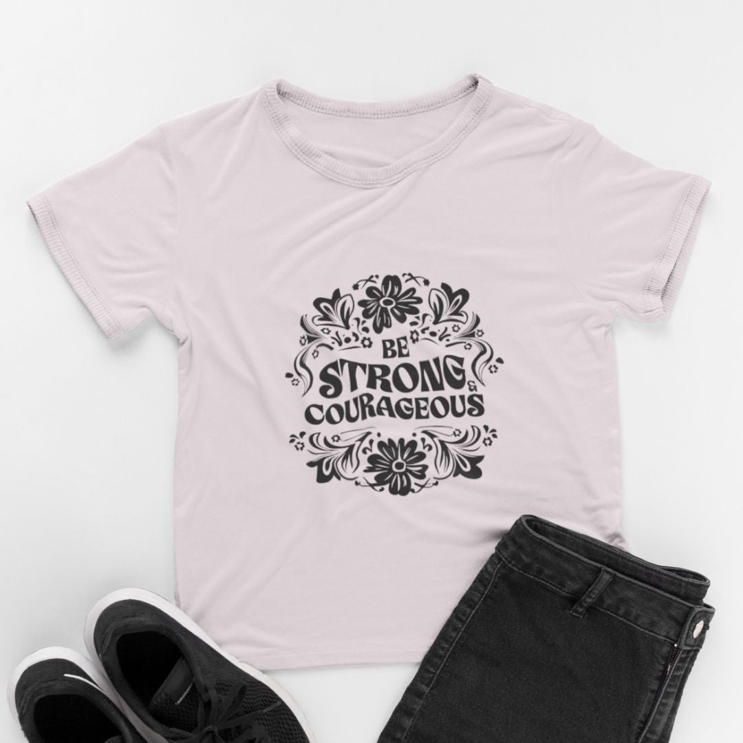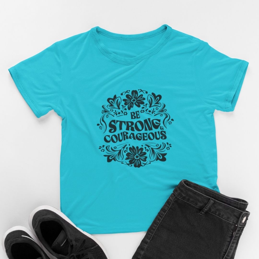 Design: Front and centre, the tee features the bold, inspiring words "Be Strong & Courageous" in vibrant, kid-friendly colours. The letters are styled in a playful, easy-to-read font, capturing the essence of childhood strength and bravery.