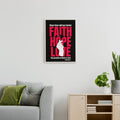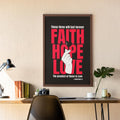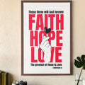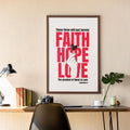 The frame features elegant, script-style lettering of the words "Faith," "Hope," and "Love" with each word artistically emphasized to resonate its profound meaning. The background blends harmonious shades that evoke a sense of peace and serenity, making it a perfect spiritual addition to any room.