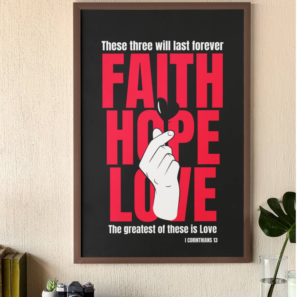 Constructed with high-quality materials, the "Faith, Hope, Love" frame is available in a choice of polished wood or sleek metal finishes, allowing it to complement any home or office décor. Whether hung on a wall or displayed on a desk, this frame serves as a constant reminder of the important things in life.