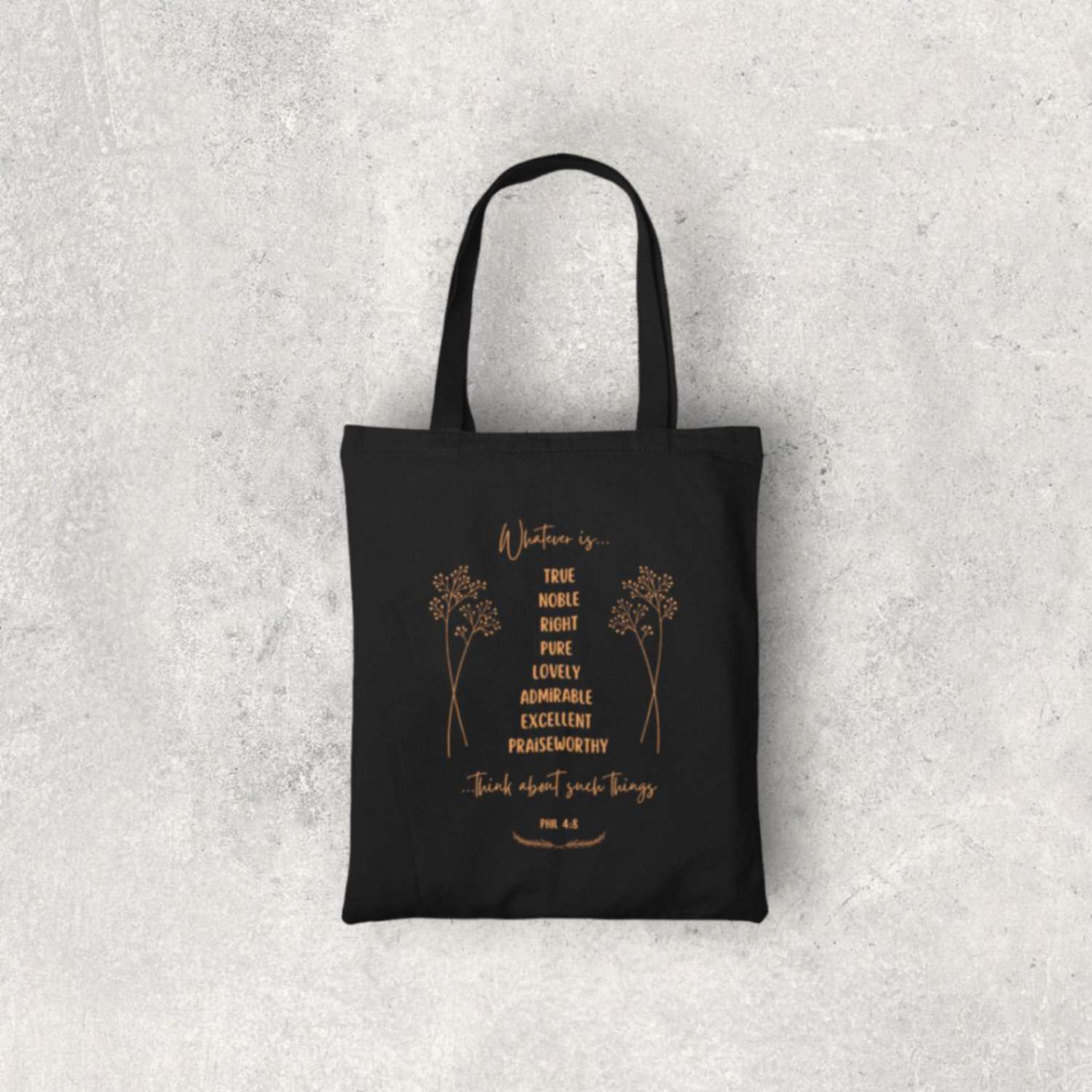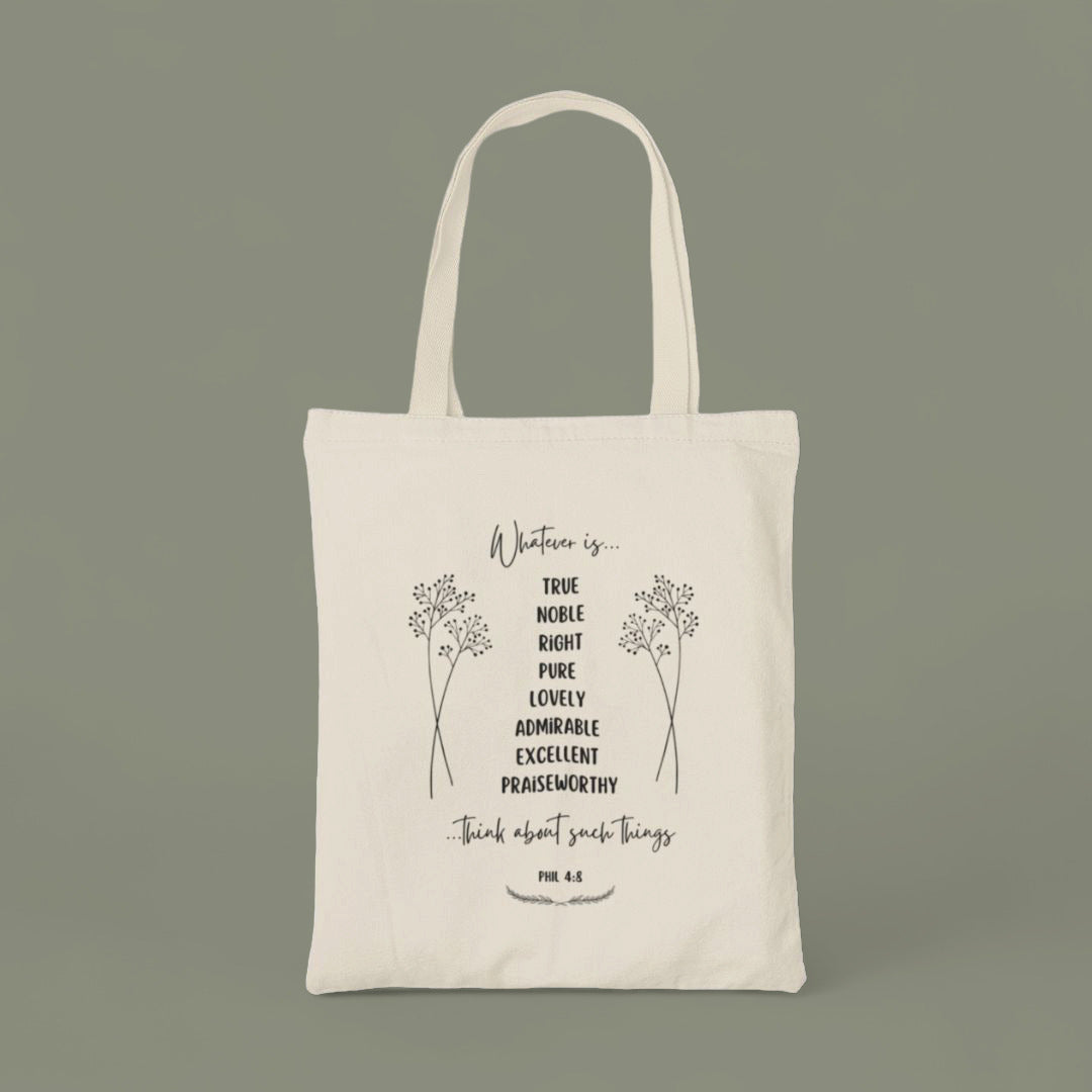 Celebrate the abundance of blessings in your life with each step you take. Elevate your daily essentials with the "Philippians 4:8" Christian Canvas Tote Bag, available in classic black or natural white. Carry your faith and blessings with style, and inspire others along the way. Don't miss out – secure your Christian canvas tote bag today and embrace your journey with gratitude and grace!