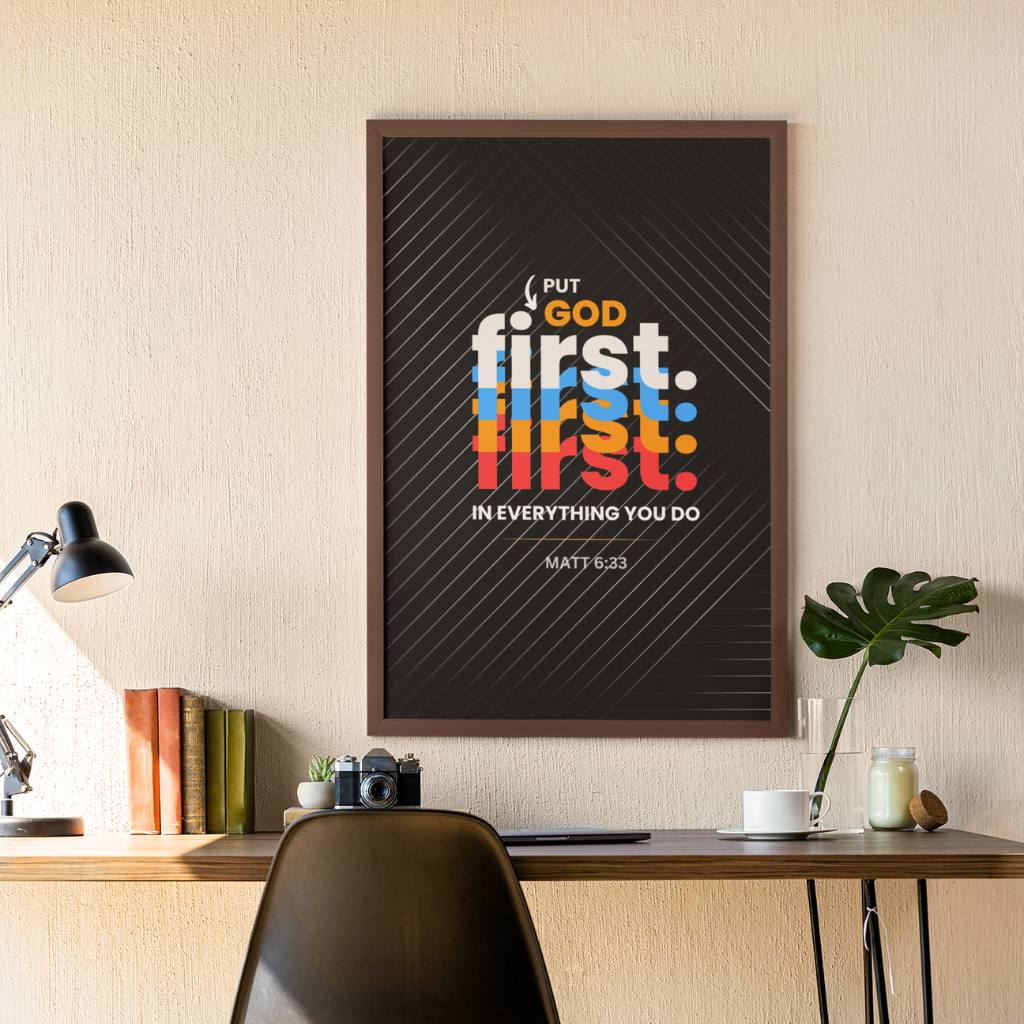 The frame features elegant, script-style lettering of the words "Put God First" with each word artistically emphasized to resonate its profound meaning. The background blends harmonious shades that evoke a sense of peace and serenity, making it a perfect spiritual addition to any room.
