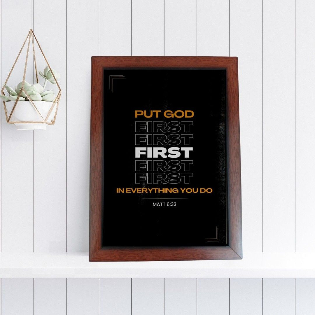 Constructed with high-quality materials, the "Put God First" frame is available in a choice of polished wood or sleek metal finishes, allowing it to complement any home or office décor. Whether hung on a wall or displayed on a desk, this frame serves as a constant reminder of the important things in life.