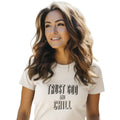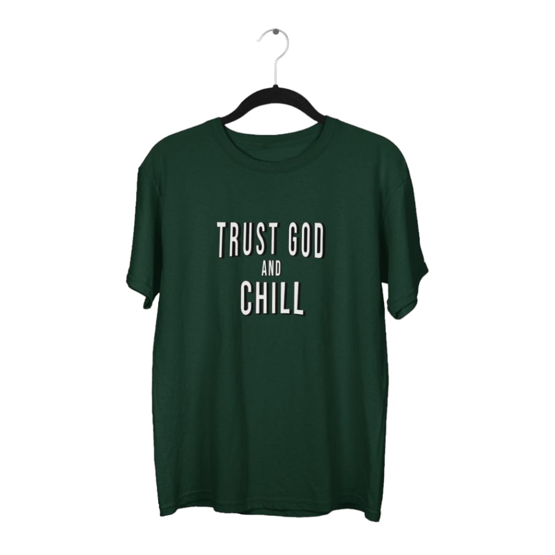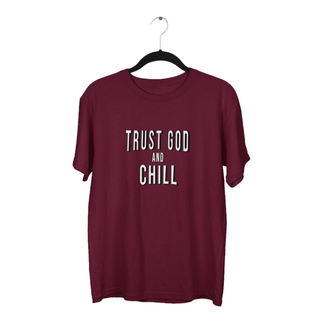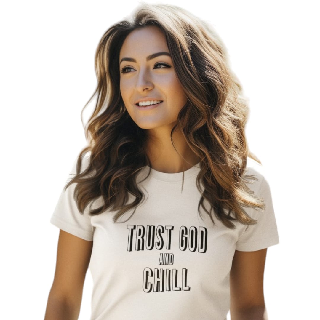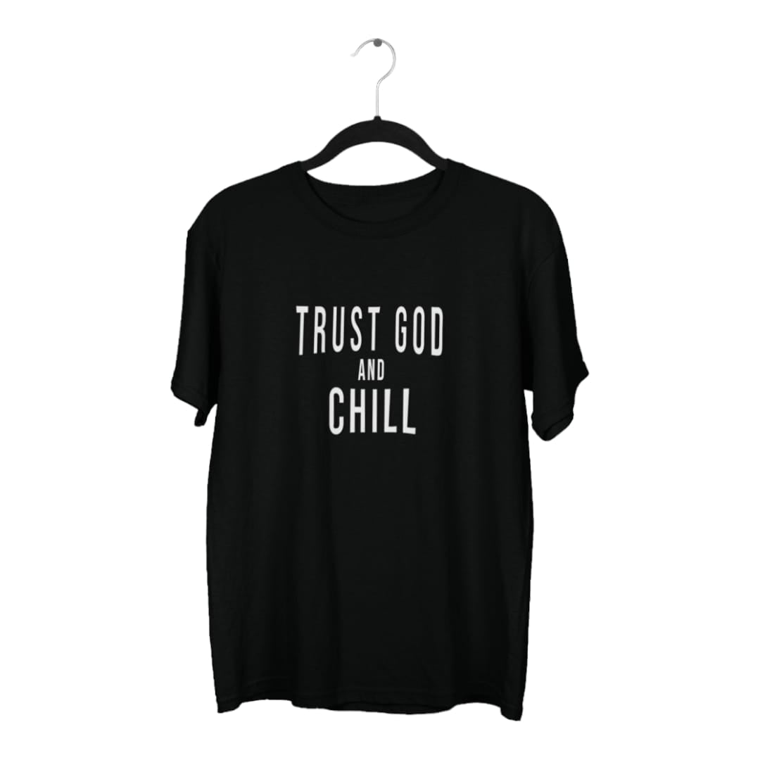 Crafted from premium, soft cotton, this tee ensures all-day comfort whether you're lounging at home or out with friends. The playful design features the phrase "Trust God and Chill" in a relaxed, contemporary font, cleverly nodding to the popular "Netflix and Chill" but with a wholesome, faith-based twist.