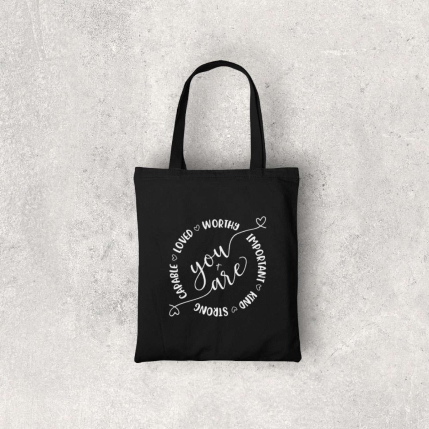 Experience the joy of being "You Are" with our Christian Canvas Tote Bag. Crafted from high-quality canvas material, this tote bag is a perfect blend of style, spirituality, and functionality. Available in timeless black and pristine white, it's designed to complement your daily life with an abundance of faith.